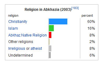According to a survey held in 2003, 60% of respondents identified themselves as Christian, 16% as Muslim, 8% as atheist or irreligious, 8% as adhering to the traditional Abkhazian religion or as Pagan, 2% as follower of other religions and 6% as undecided.
