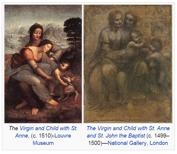 In the painting Virgin and Child with St. Anne the composition again picks up the theme of figures in a landscape which Wasserman describes as "breathtakingly beautiful" and harkens back to the St Jerome picture with the figure set at an oblique angle. What makes this painting unusual is that there are two obliquely set figures superimposed. Mary is seated on the knee of her mother, St Anne. She leans forward to restrain the Christ Child as he plays roughly with a lamb, the sign of his own impending sacrifice. This painting, which was copied many times, influenced Michelangelo, Raphael, and Andrea del Sarto, and through them Pontormo and Correggio. The trends in composition were adopted in particular by the Venetian painters Tintoretto and Veronese.