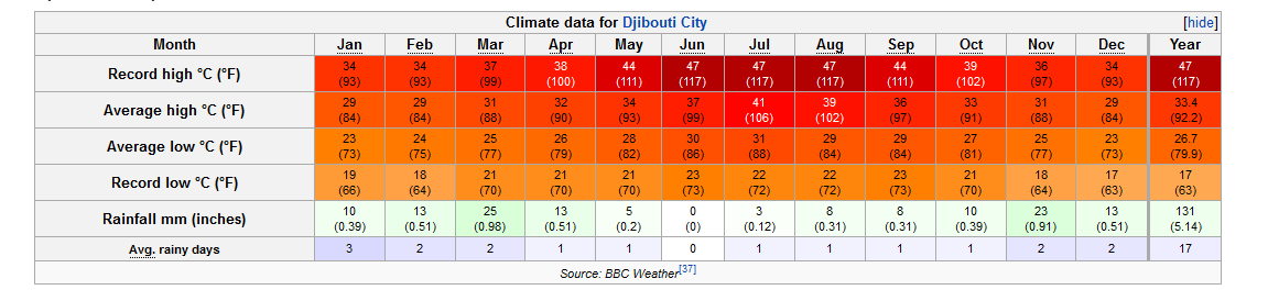 Djibouti's climate ranges from arid in the northeastern coastal regions to semiarid in the central, northern, western and southern parts of the country. On the eastern seaboard, annual rainfall is less than 5 inches (131 mm); in the central highlands, it is about 8 to 11 inches (200 to 300 mm). Although the coastal regions are hot and humid throughout the year, the hinterland is typically hot and dry. The climate on the coast is mild, with wet winters and warm, sunny and rather dry summers.